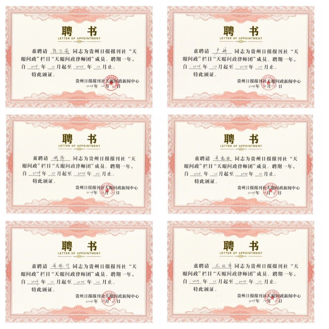2024年10月11日,惟胜道陈万莉、郑彬、胡昂、杨伟民、尹姮、黄露颖、黄雅竹、兰双苹、石中晟、杨泽松、卢娇等11位律师被贵州日报报社刊受聘为“天眼问政”栏目“天眼问政律师团”成员。聘期一年。此次聘任不仅是对律师个人专业能力的高度认可,也是对惟胜道律师法律服务专业水平的肯定。