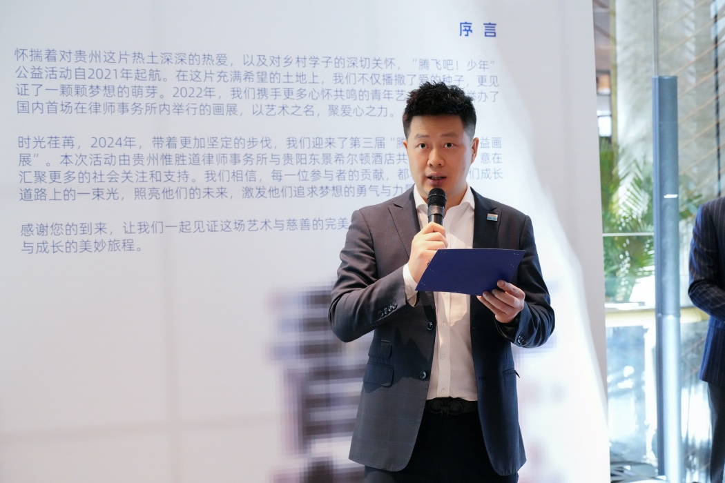 带着更加坚定的步伐,2024年10月13日,由贵州惟胜道律师事务所与贵阳东景希尔顿酒店联合主办的第三届“腾飞”青年艺术公益画展在贵阳东景希尔顿酒店隆重举行。作为“腾飞吧!少年”公益活动的重要组成部分,画展旨在为贵州的青年艺术家们提供一个展示才华、交流思想的平台,鼓励他们在艺术的广阔天空中自由翱翔,勇敢追逐自己的梦想。